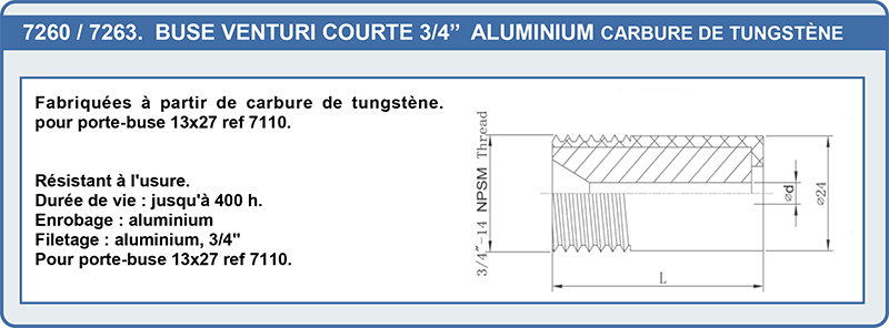| 7263 | Buse venturi courte 3/4 alu Tungstène ø8 Lg : 45 mm | 65,90 € |