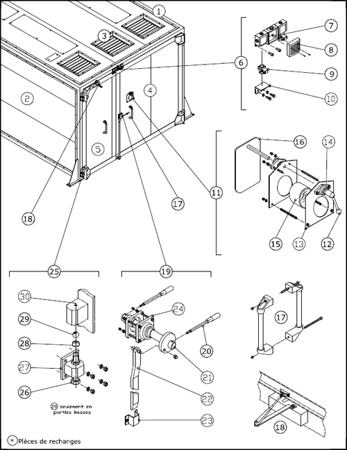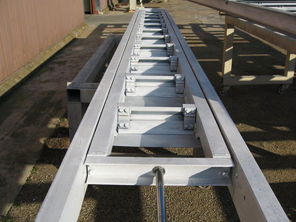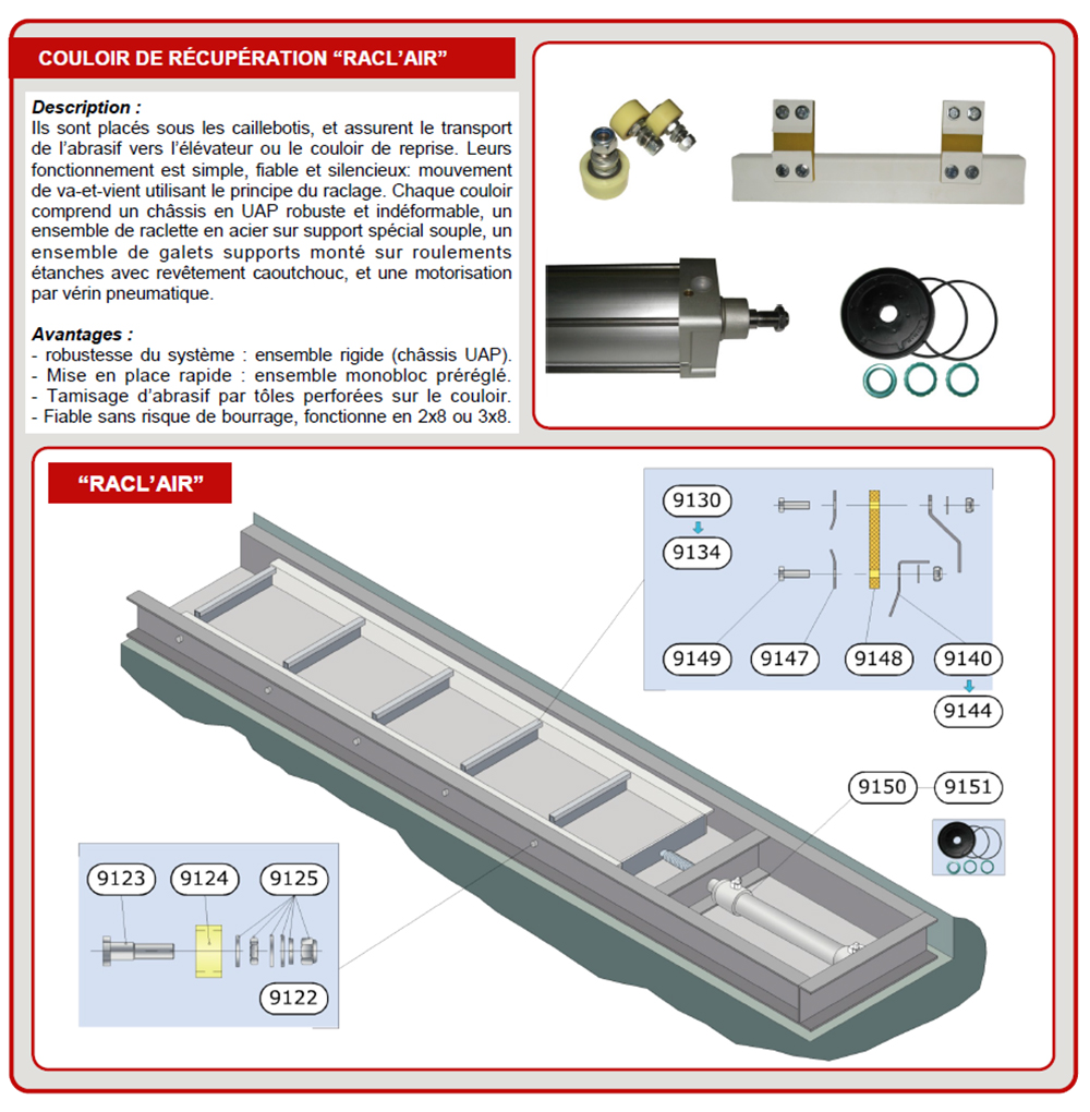 Le couloir « Racl’air » est constitué d’une structure rigide en UPN de 140 dans laquelle coulisse un cadre sur galets à bandage à roulements à billes étanches. Les raclettes sont reliées à un cadre par une liaison spéciale souple.