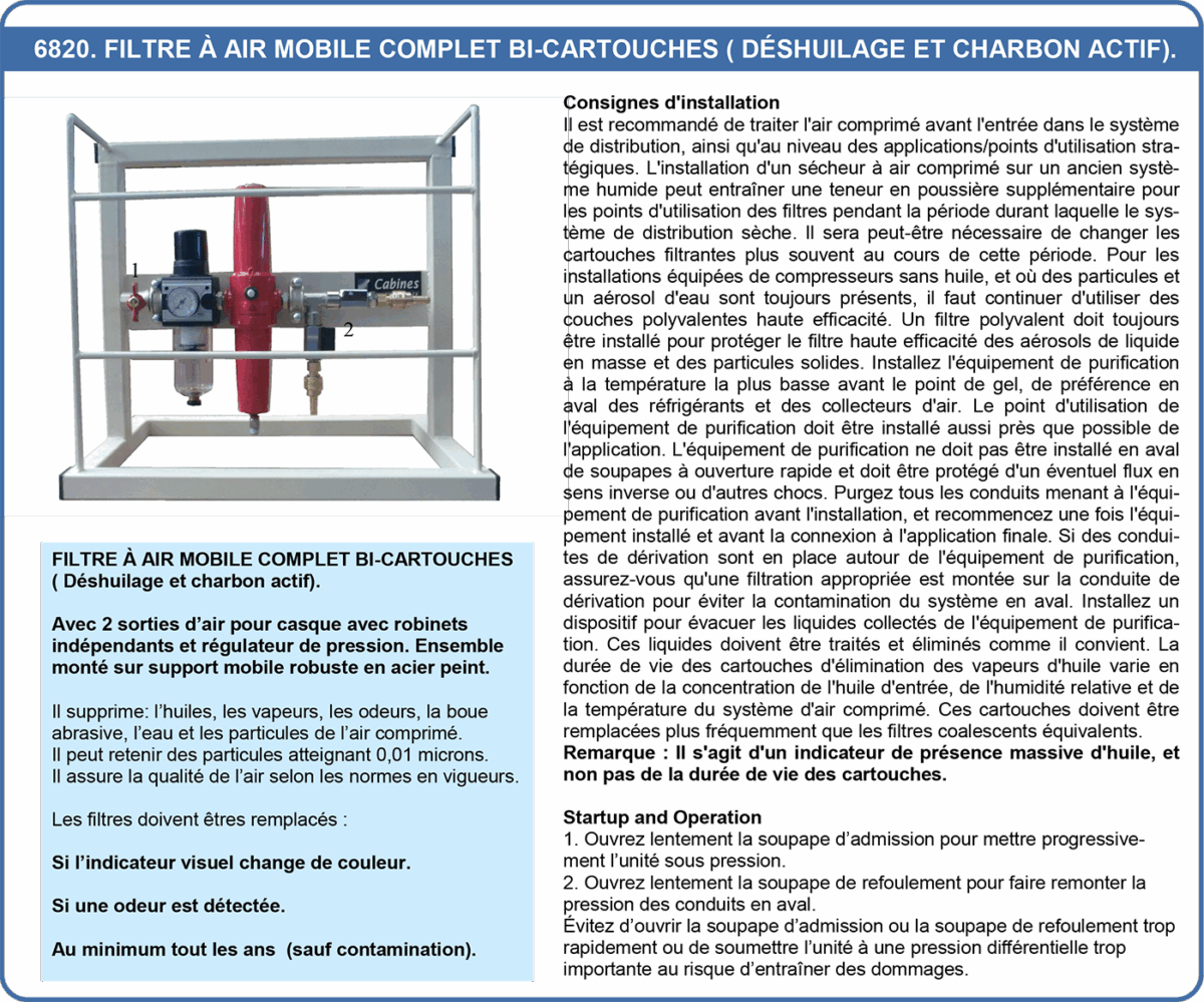 | 6820 | Filtre à air bi-cartouches sur support (régulateur. mano. 2 sorties) | 1315,00 € |